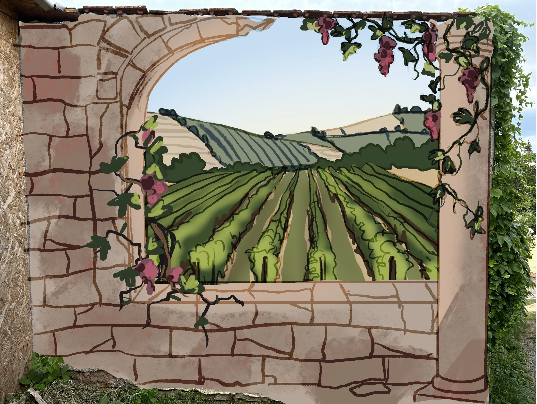 After the initial design consultation, we decided to go for a semi-realistic approach and paint a view of the surrounding mountains and vineyards behind the wall with a more Greek twist.